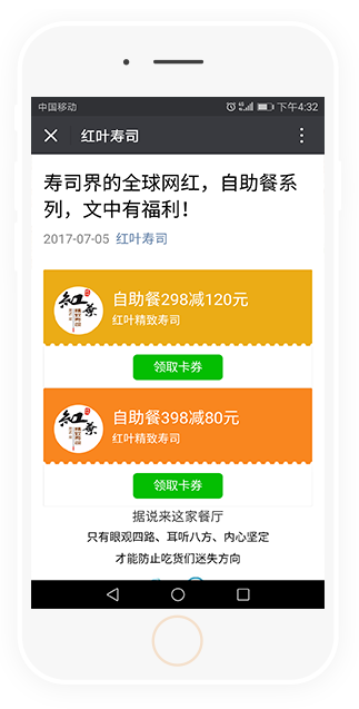 推廣你的微信卡券,將優(yōu)惠信息快速觸達(dá)目標(biāo)用戶,促進(jìn)用戶轉(zhuǎn)化